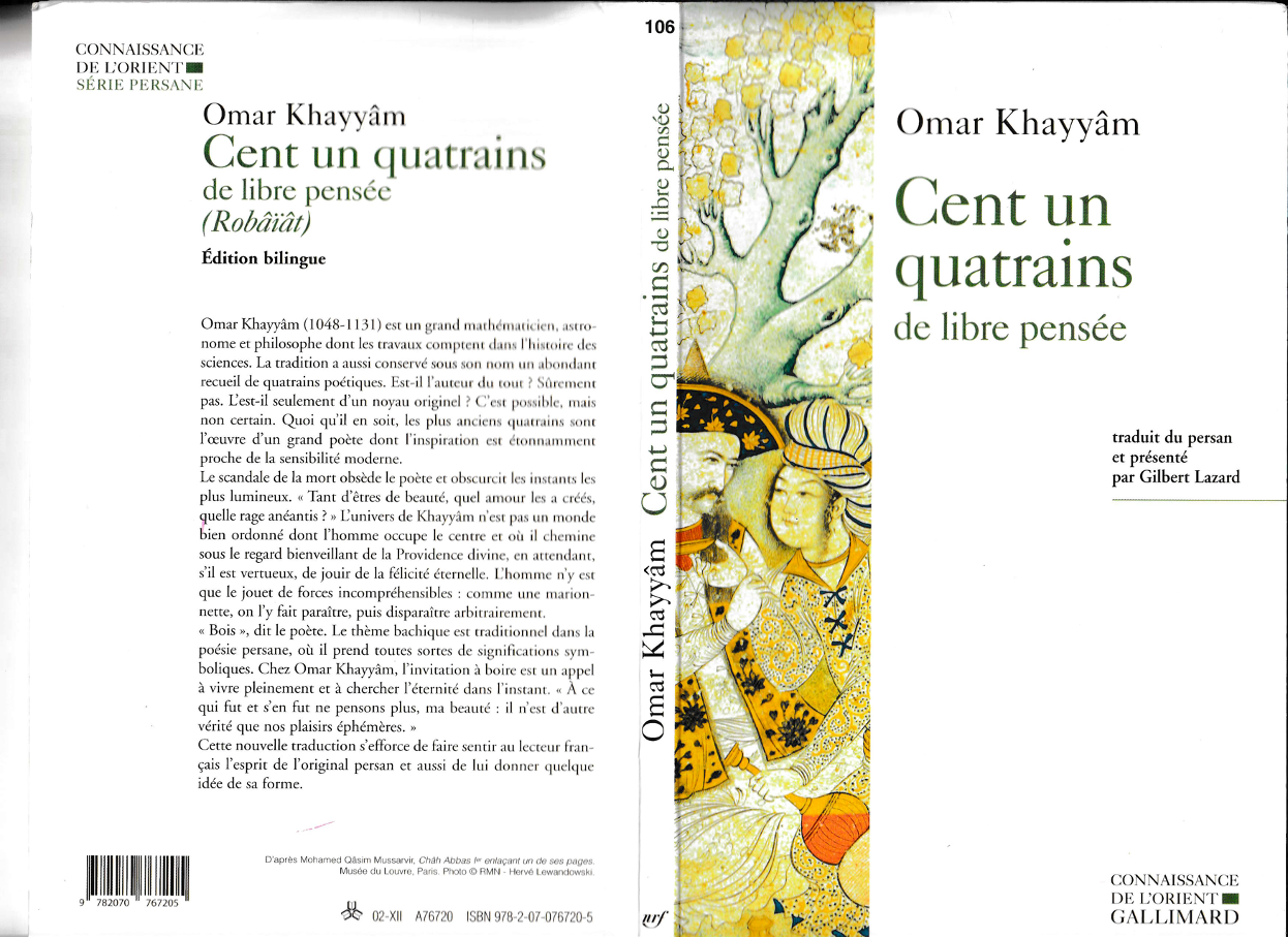 OMAR KHAYYÂM ou la liberté de vivre dans les plaisirs, dans une compagnie d’amour et d’amitié… chacun de ces quatrains est une fleur effeuillée sur l’épaule de l’être aimé, et une rasade de plus de ce vin qui fait chanter la joie. Les rimes y sont riches de ce que l’on peut souhaiter de mieux à l’humanité entière, bonheur, bonheur, bonheur